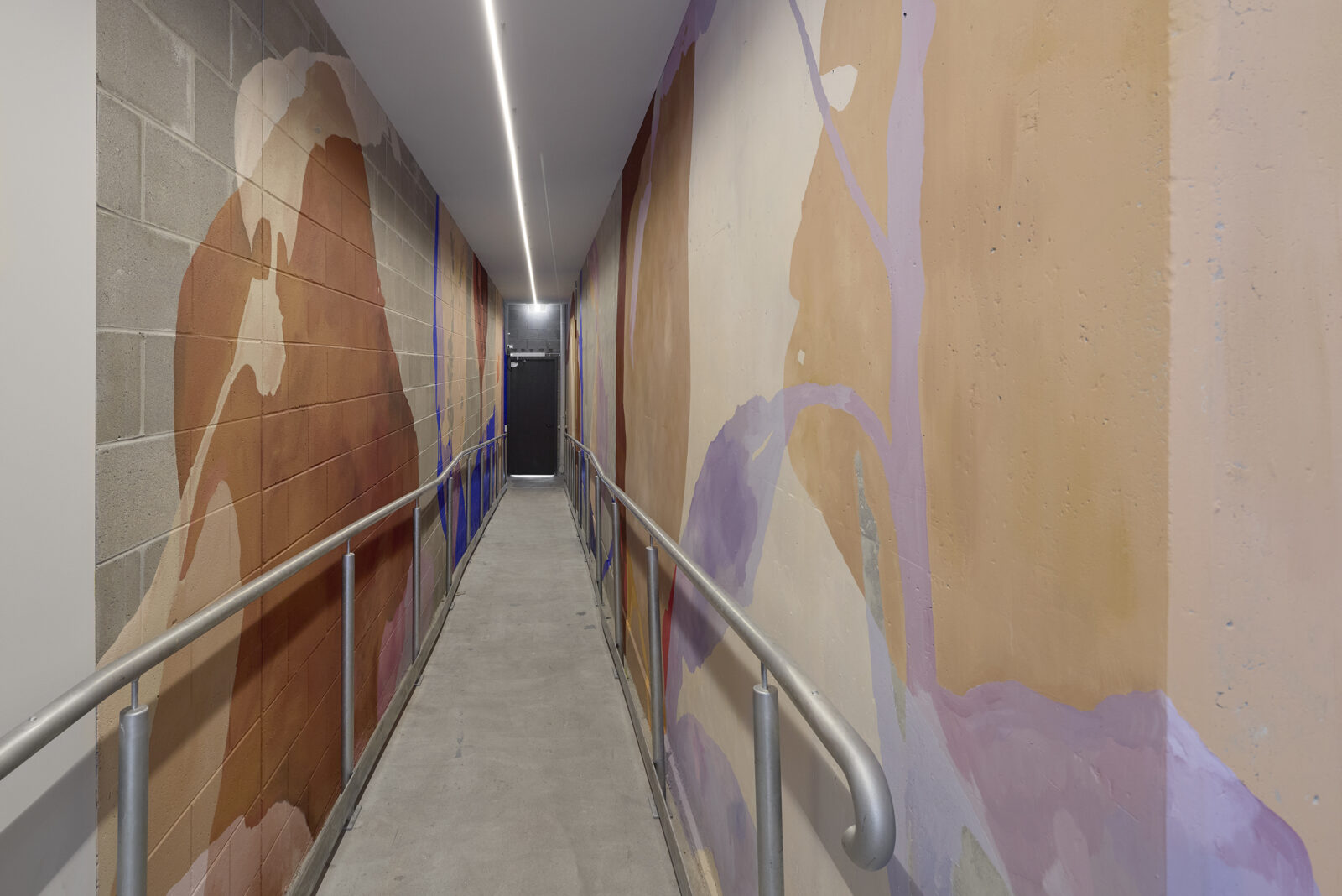 The lines of colours encourage the viewer to pause and observe the subtle, often overlooked moments in nature— reflecting on the delicate lavenders and pinks of eucalyptus bark, or the vibrant hues of fungi hidden beneath layers of foliage found along the paths nearby. Clare’s background as a painter deeply informs her artistic practice. You can sense her keen attention to the environment, where even the smallest shifts in light, texture, and colour speak volumes. Through her expertise in colour, Clare translates these observations of the minute into a large-scale mural that mirrors both the bold and quiet transformations of landscape. Look Closely invites you to slow down, connect with your surroundings, and discover the often-hidden, layered beauty and colour within nature.